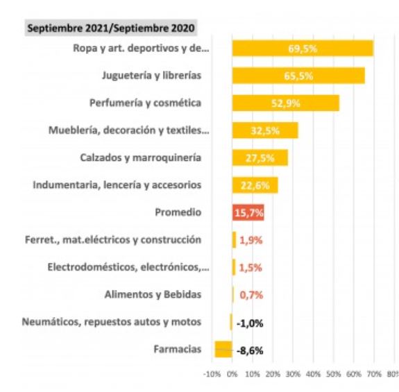 En relación a septiembre de 2020, las ventas en el segmento retail aumentaron 11,4%, con las mayores tasas de variación anual en Ropa y Artículos Deportivos y de Recreación que crecieron un 69,5% y Jugueterías y Librerías que escalaron un 65,5%. De los 11 rubros relevados solo dos terminaron con caídas: el ya mencionado de Farmacias y Neumáticos y Repuestos de Autos y Motos que retrocedió -1,0%.