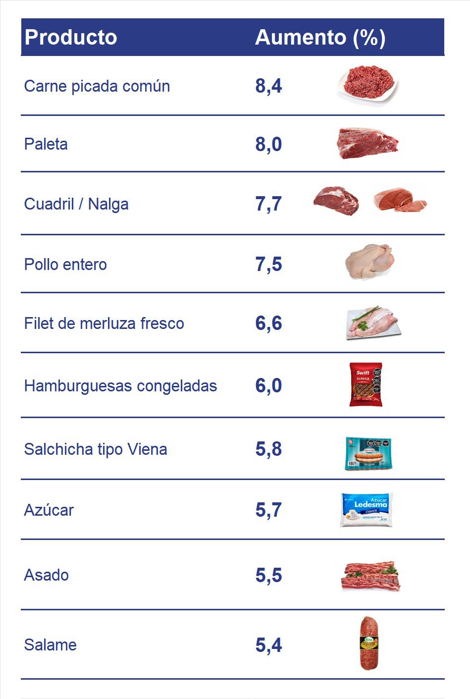 En la canasta general, en tanto, los productos que más se dispararon fueron la carne picada común, con el 8,4%; la paleta, que se retocó un 8,0%; el cuadril y la nalga, cuyos aumentos fueron del 7,7%; el pollo entero, con un alza del 7,5%; y el filet de merluza fresco, que aumentó un 6,6% en el mes.