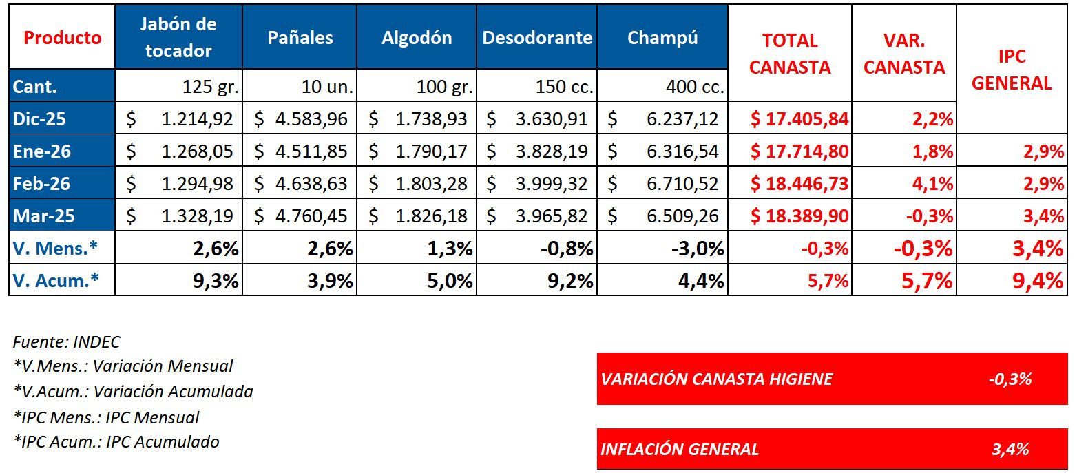 En el tercer mes del año la inflación sigue siendo protagonista. Según el INDEC el IPC fue del 3,4%. En cambio, en la canasta de higiene el grupo de productos cayó un -0,3%, aunque acumula un alza del 5,7% en el trimestre. Ver informe | Ver IPC marzo