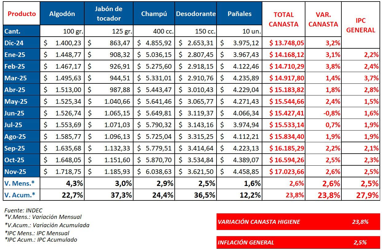 La canasta de higiene mostró un comportamiento bastante dispar durante el mes de noviembre y según los datos publicados por el INDEC. Aunque varios artículos incluidos en este grupo registraron fuertes aumentos, y por encima del IPC. Ver IPC noviembre