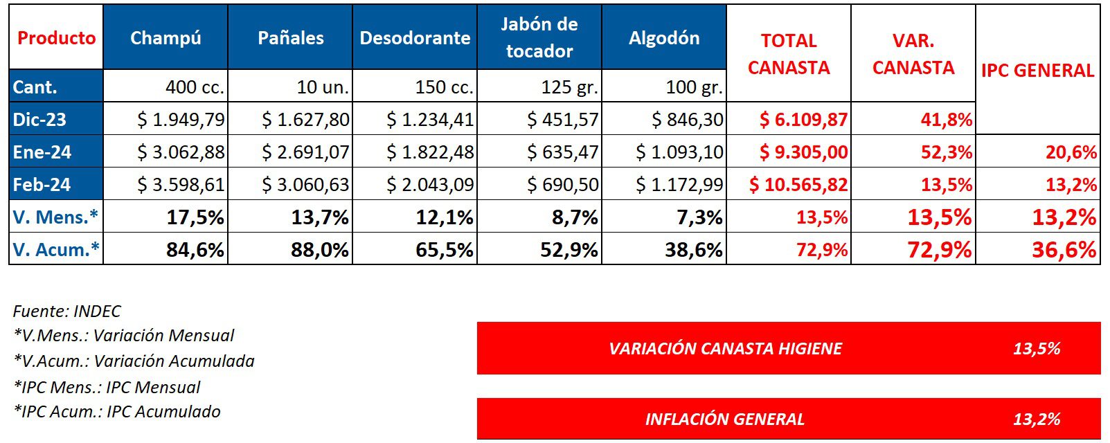 Y esta vez el ritmo de aumentos de la canasta de higiene estuvo casi en consonancia al alcanzar el 13,5%. Aunque hubo algunos productos que se desmarcaron. De acuerdo con los datos del INDEC, el champú aumentó un 17,5% en febrero, superando y bastante al promedio del IPC, a la vez que acumula una suba del 84,6% en el primer bimestre. Los que también superaron al índice general fueron los pañales, que tocaron un 13,7% en febrero y marcaron un total del 88% en este verano. Ver INDEC
