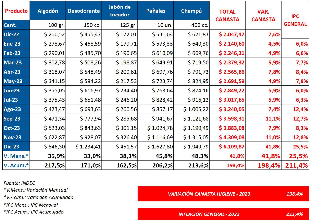 Así se supo que en el año cerrado la suba de los productos de la canasta de higiene fue del 198,4%, mientras que la canasta general fue del 211,4%. Ver nota INDEC