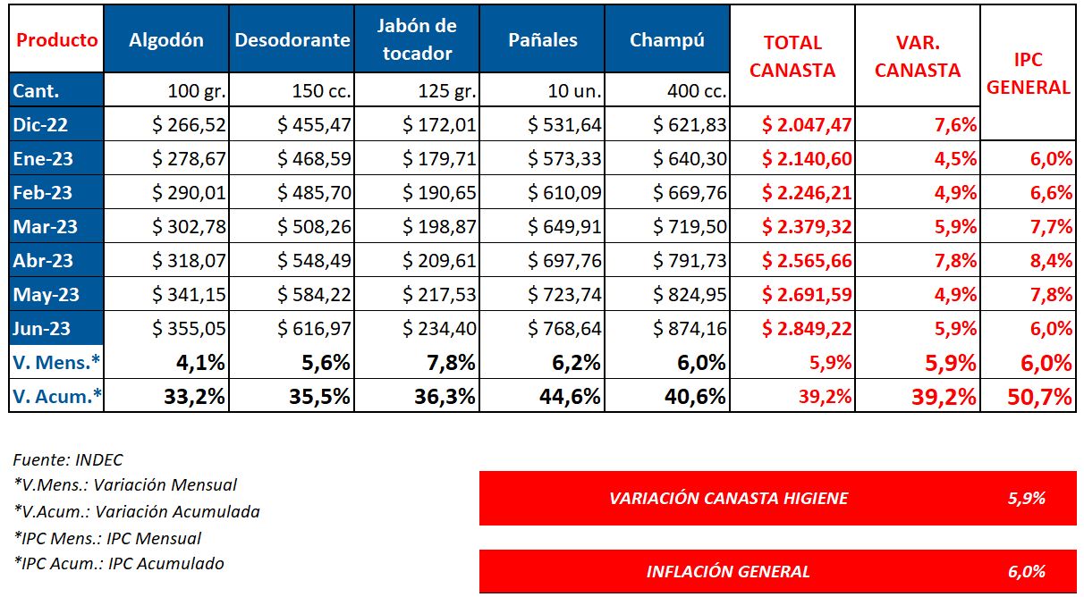Así, al momento, la canasta general registra una suba del 50,7% en lo que va del año. Mientras que la canasta de higiene alcanzó un aumento semestral del 39,2%. Esto significa que se encuentra en 11,5 puntos porcentuales por debajo del IPC. Ver INDEC.