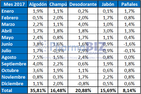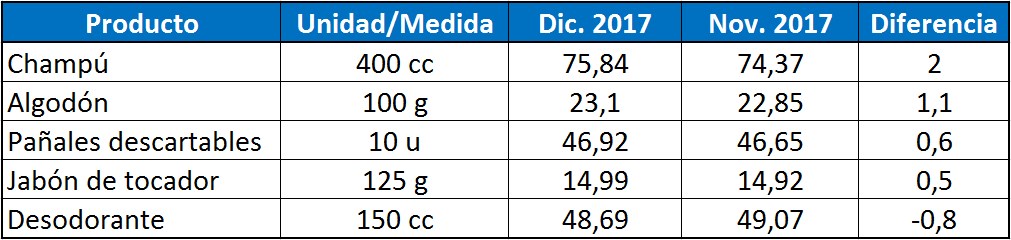 La canasta de higiene mostró un incremento del 19,4% durante el 2017, ubicándose 5,4 puntos por debajo de la inflación general que fue del 24,8%. El algodón totalizó el año con un ascenso del 35,8%, colocándose por encima del IPC anual.