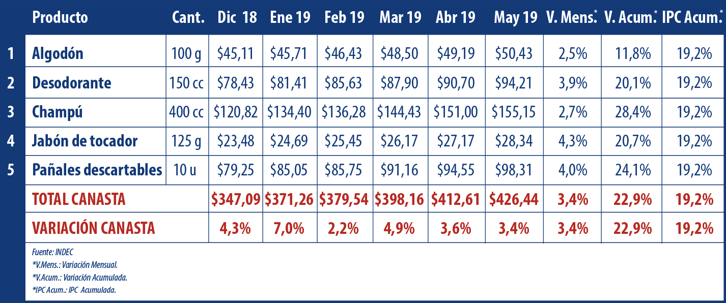 Según el INDEC el conjunto de productos de la canasta de higiene costaron durante mayo un total de $426,44 mientras que en abril se comercializaban a $412,61. Así, la canasta de higiene relevada por el INDEC exhibió un alza del 3.4% al comparar mes contra mes y en los primeros cinco meses del año ya acumula un aumento del 22.9%, mientras que el IPC fue del 19.2%. Ver artículo.