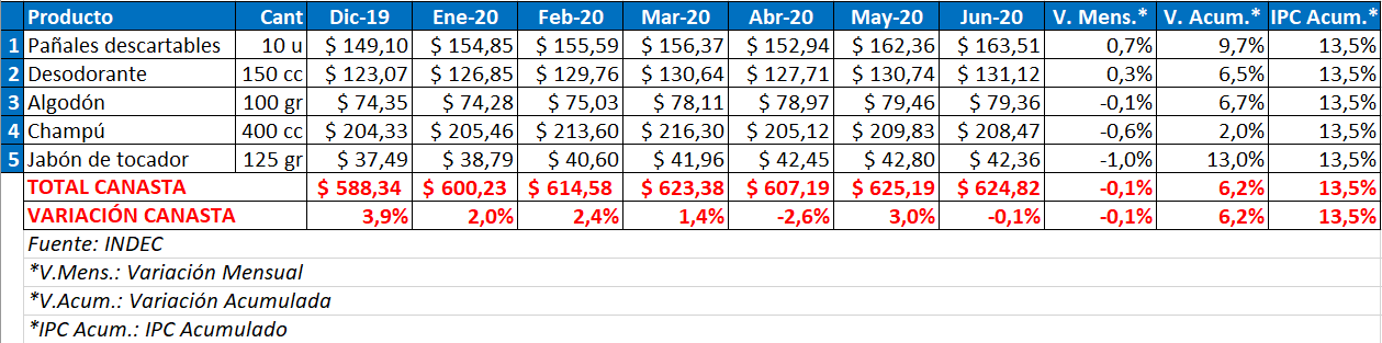 Si lo que se analiza es el comportamiento de este grupo de productos durante el primer semestre de 2020, también se observa una notable diferencia con el IPC general. El mismo muestra en esta primera parte del año una variación acumulada del 6.2% para el grupo de productos de higiene incluidos en el check list del organismo estatal. El IPC general, en tanto, y que incluye principalmente alimentos, llegó al 13.5% hasta junio.