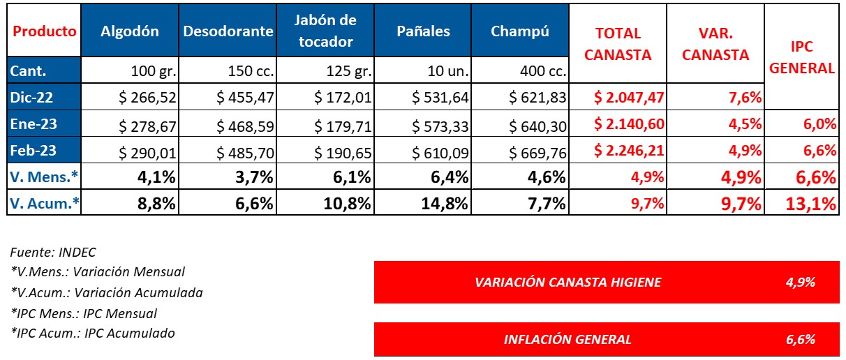 Los precios de la economía argentina siguen en una agresiva escalada inflacionaria. En este sentido, la canasta de higiene no se constituye en una excepción. En febrero y según datos del INDEC, la misma trepó un 4,9%. Ver INDEC.