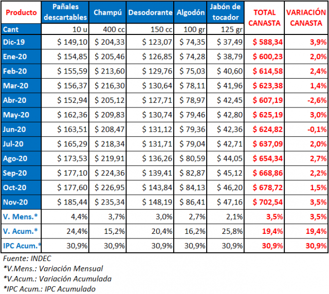 Los pañales descartables se destacaron a lo largo del 2020 como uno de los ítems que más treparon en esta canasta, y en noviembre esta tendencia se repitió al mostrar una variación del 4.4%, más de un punto por encima de la inflación general. Así, este producto básico ya acumula un incremento del 24.4% en lo que va del año. En segundo lugar se ubicó el champú, con un 3.7% mensual y 15.2% durante los once meses de este período. Ver artículo agosto. Ver artículo mayo.