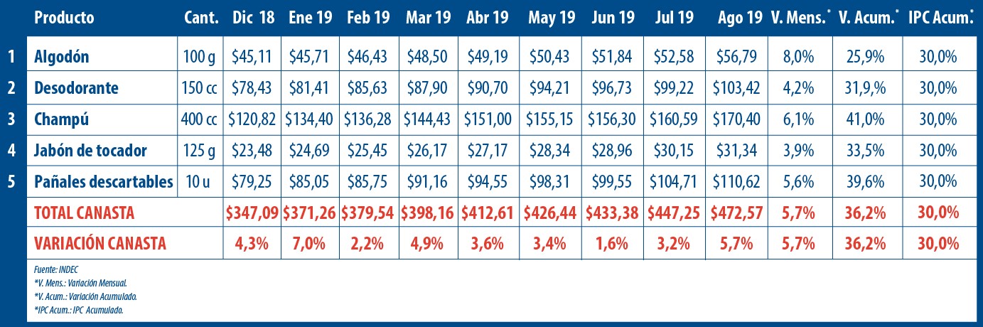 Según el INDEC el conjunto de productos de la canasta de higiene costaron durante agosto un total de $472,57 mientras que en julio se comercializaban a $447,25. Así, la canasta de higiene relevada por el INDEC exhibió un alza del 5.7% al comparar mes contra mes y en los dos primeros cuatrimestres que van del año ya acumula un aumento del 36.2%, mientras que el IPC fue del 30%. Ver artículo.