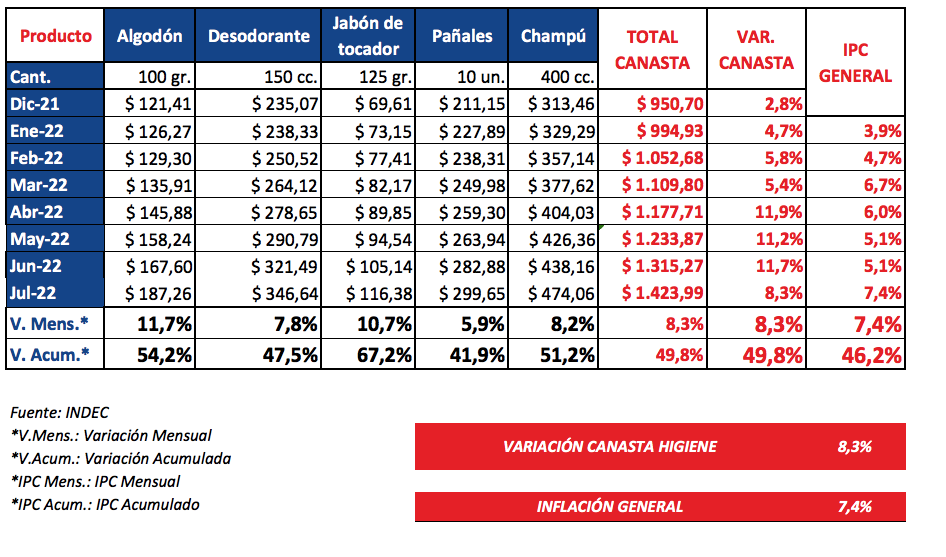 En julio el IPC fue del 7,4% según el informe que dio a conocer ayer el INDEC. A dicha embestida de los precios se la definió como la peor de los últimos 20 años. Pero el gran dato es que la variación de precios de la canasta de higiene fue mayor. Ver artículo INDEC IPC julio.