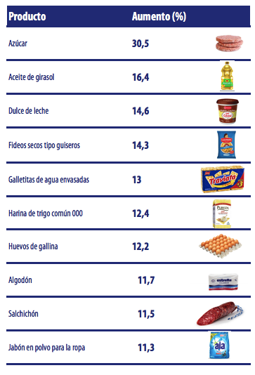 En julio la canasta de higiene se comercializó a $1.423,99 (u$s 10,10), mientras que en junio implicaba un desembolso de $1.315,27 (u$s 9,72*). Además del algodón, los productos que más aumentaron de la canasta general fueron el azúcar, que se desbocó con un 30,5%; el aceite de girasol, que osciló un 16,4%; el dulce de leche, que anotó un alza del 14,6% mensual; los fideos secos tipo guisero, un alimento básico que subió un 14,3%; y las galletitas de agua envasadas, que se incrementaron un 13%. Ver listado.