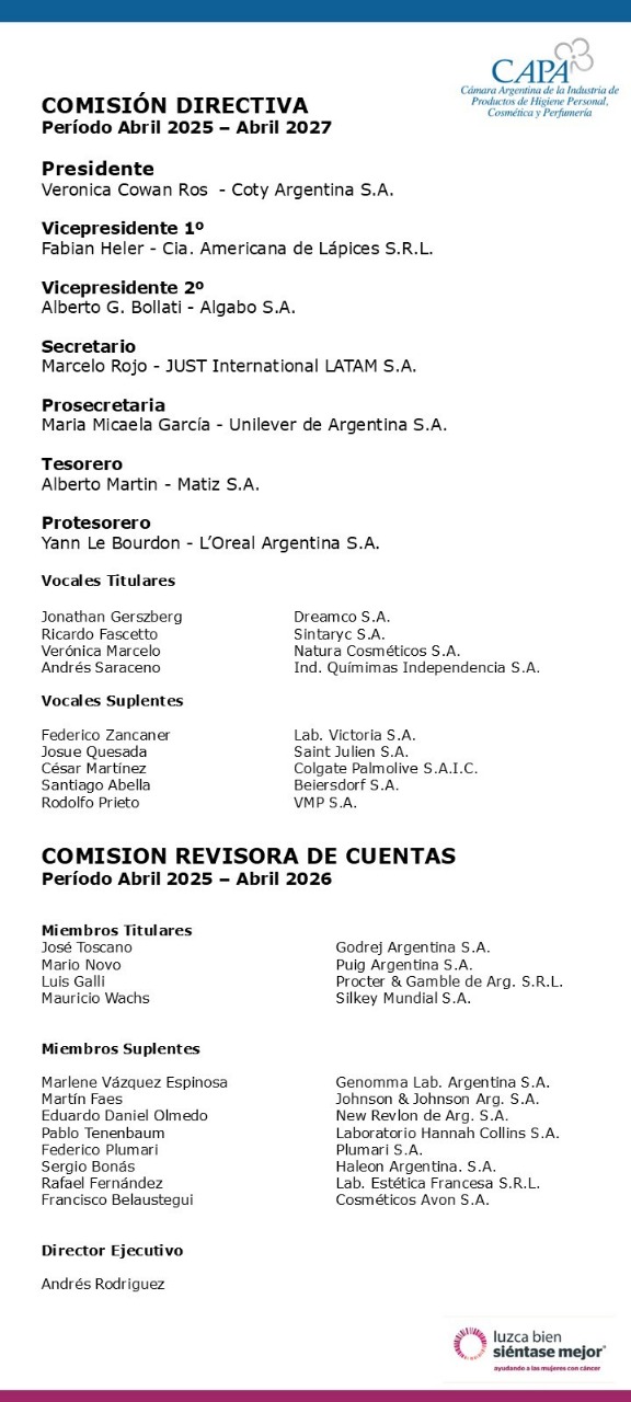 En tanto, el director Ejecutivo será Andrés Rodríguez. Por su parte, el vicepresidente 1º será Fabian Heler, de la Cia. Americana de Lápices; y el vicepresidente 2° será Alberto Bollati, de Algabo. La Cámara Argentina de la Industria de Productos de Higiene Personal, Cosmética y Perfumería agrupa a empresas de consumo masivo y venta directa, terceristas, importadoras y exportadoras. Entre ellas, se puede mencionar a la británica Unilever; a la alemana Beiersdorf; la nacional Algabo; la nacional Dreamco; y la sueca Essity, por citar algunas.