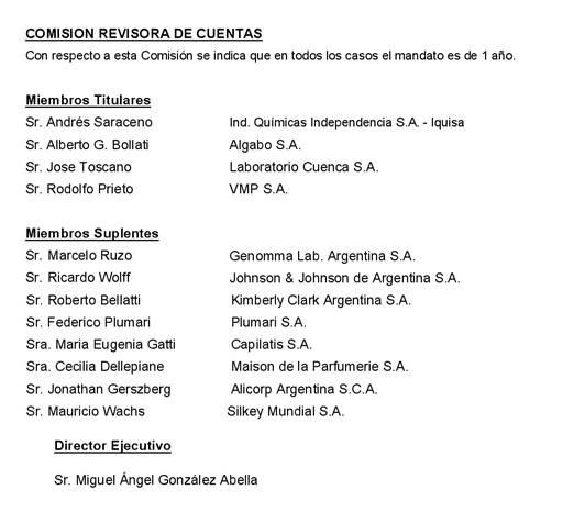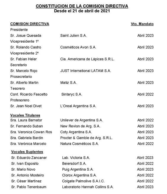 Por último, los vocales suplentes que quedaron listados fueron: Eduardo Zancaner, de laboratorio Victoria; Iván Esposito, de la alemana Beiersdorf; Mario Novo de la española Puig; Antonio Mosteiro, de Clorox; César Martínez, de Colgate; y Pablo Tenenbaun, de Hannah Collins. Mientras que la dirección ejecutiva seguirá bajo la responsabilidad de Miguel Ángel González Abella.
