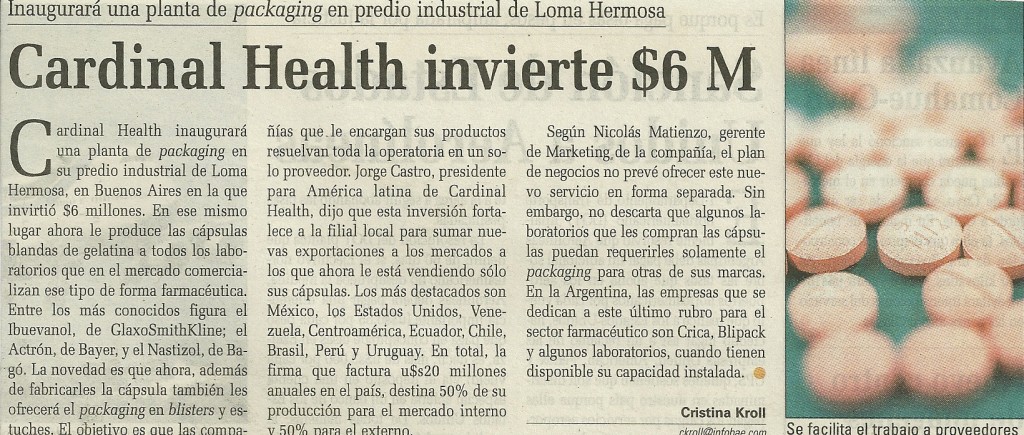 Cardinal Health inaugurará una planta de packaging en su predio industrial de Loma Hermosa, en Buenos Aires en la que invirtió $5 millones. En ese mismo lugar ahora le produce las cápsulas blandas de gelatina a todos los laboratorios que en el mercado comercializan ese tipo de forma farmacéutica. Entre los más conocidos figura el Ibuevanol, de GlaxoSmithKline; el Actrón, de Bayer, y el Nastizol, de Bagó. La novedad es que ahora, además de fabricarles la cápsula también les ofrecerá el packaging en blisters y estuches. El objetivo es que las compañías que le encargan sus productos resuelvan toda la operatoria en un solo proveedor. Jorge Castro, presidente para América Latina de Cardinal Health, dijo que esta inversión fortalece a la filial local para sumar nuevas exportaciones a los mercados a los que ahora le está vendiendo sólo sus cápsulas. Los más destacados son México, los Estados Unidos, Venezuela, Centroamérica, Ecuador, Chile, Brasil, Perú y Uruguay. En total, la firma que factura u$s20 millones anuales en el país, destina 50% de su producción para el mercado interno y 50% para el externo.
