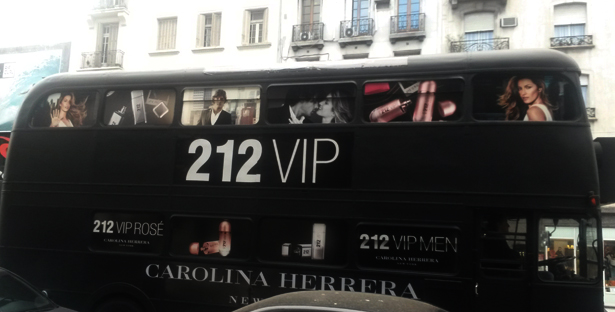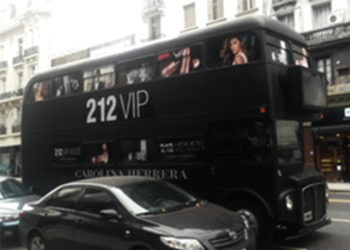 La marca Carolina Herrera está recorriendo diferentes minoristas en un double-decker negro ploteado con imágenes de su 212 VIP Men.