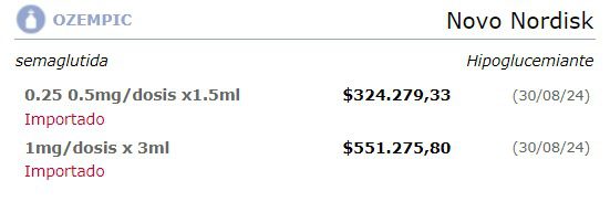 En la Argentina, en tanto, y según los precios de lista, Ozempic cuesta $324.279 (u$s 323,97) en su versión de 0.25 0.5 mg y $551.275 (u$s 550,75 ) para la presentación de 1mg. En tanto, Wegovy aunque aprobado por la ANMAT, todavía no se encuentra disponible para su comercialización en el mercado local. Ver Disposición