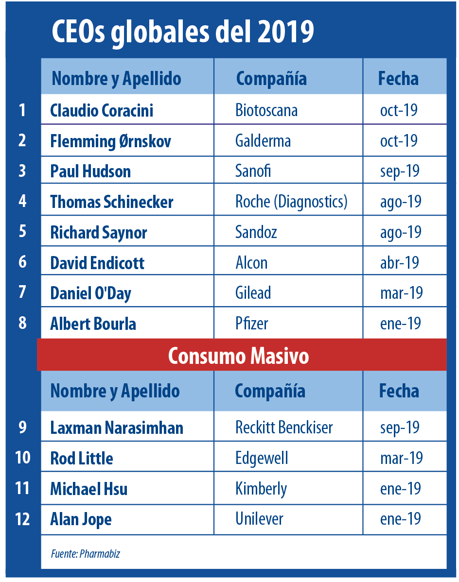 Este 2019 que está a punto de clausurarse tiene una larga lista de nuevos jefes de farma a nivel internacional. Fueron en total una docena de CEOs los que se pusieron al frente de multinacionales.