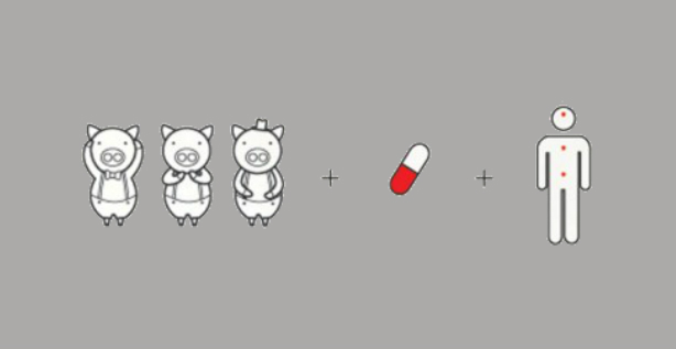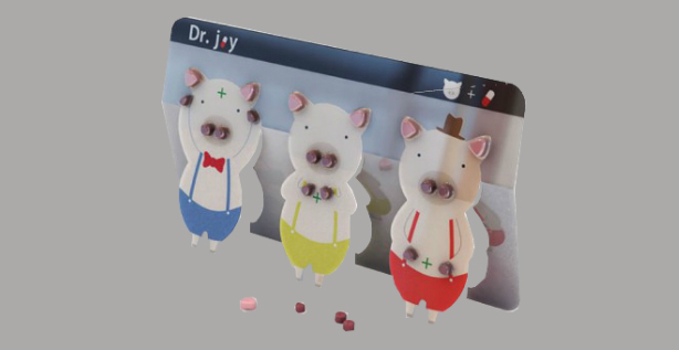 El diseño cuenta con tres cerditos en el envase y cada uno indica con sus manos para qué son las píldoras que contiene, dolores de cabeza, dolor en el pecho o dolor de estómago.