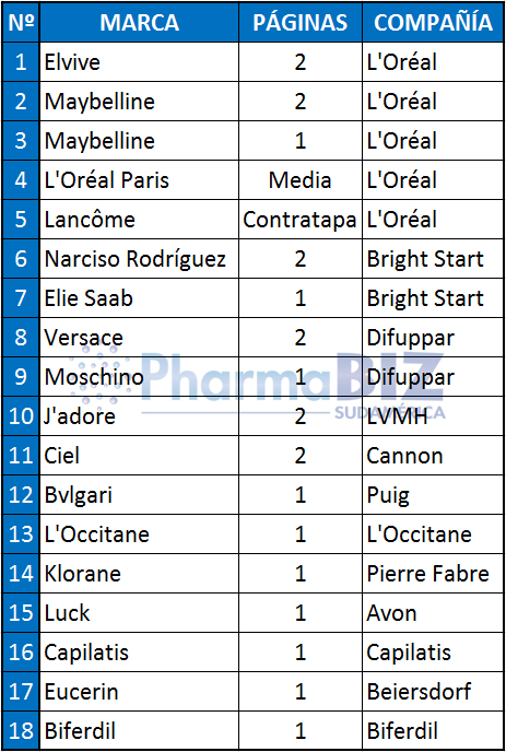 Pruebas al canto. En la edición de abril de Cosmopolitan -la previa a la del cierre-, L’Oréal resultó ser el mayor sponsor a través de sus marcas Elvive, Maybelline; Lancôme y otras. El segundo lugar fue para el distribuidor Bright Start, que figuró con sus marcas Narciso Rodrígez y Elie Saab. Y también Difuppar, que le dedicó tres páginas a Versace y Moschino.