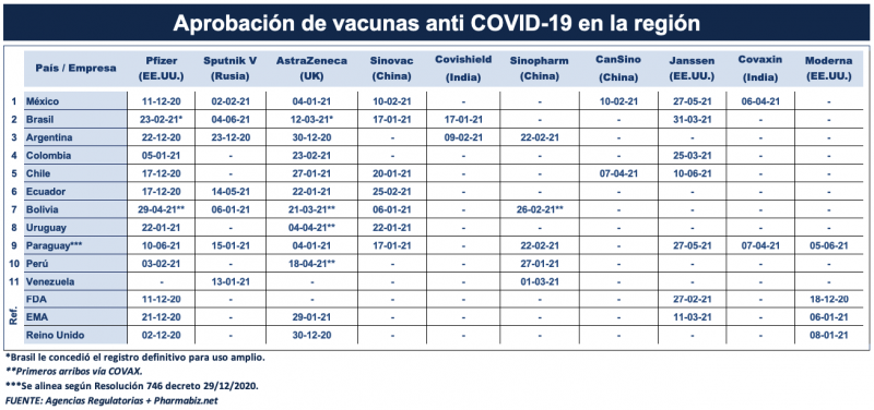 La vacuna anti COVID-19 de la norteamericana Janssen obtuvo su quinta aprobación en la región. El que la avaló fue Chile a través de su Instituto de Salud Pública –ISP– a fin de que el producto ingrese al país en el corto plazo y por medio del mecanismo COVAX. A la fecha, otros mercados que tienen autorizada la vacuna son México; Brasil; Colombia y Paraguay.