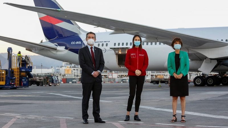 La llegada vía aérea de las vacunas fue presenciada en el aeropuerto Arturo Merino Benítez por el subsecretario de Relaciones Económicas Internacionales (SUBREI), Rodrigo Yáñez, junto a la subsecretaria de Salud, Paula Daza; y la SEREMI de Salud de la Región Metropolitana, Paula Labra.