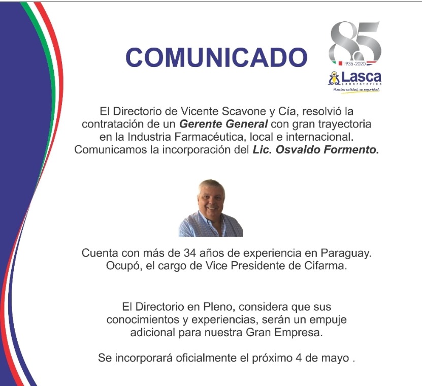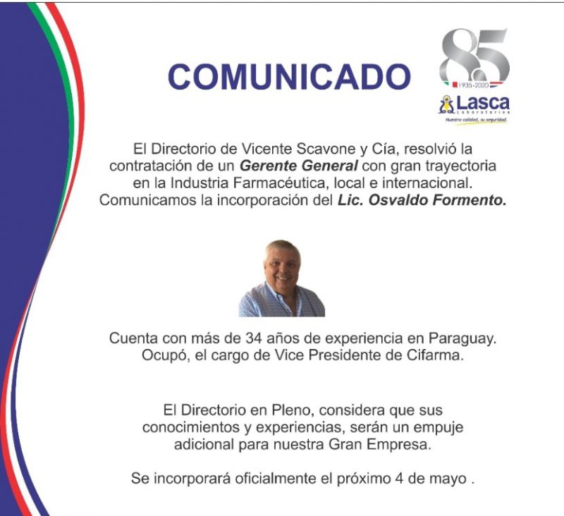 Así por caso en plena pandemia el directorio del laboratorio paraguayo Lasca sentó a un nuevo gerente general. Se trata del argentino Osvaldo Formento, quien estrena este nuevo sillón hoy, lunes 4 de mayo.