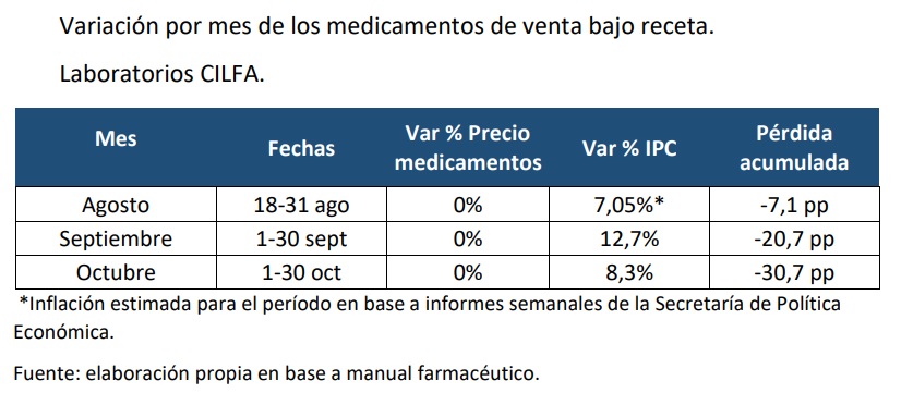 Por otro lado, desde CILFA remarcaron que también es necesario considerar el atraso del precio de los medicamentos producido durante octubre, ya que los medicamentos de prescripción de los laboratorios asociados de CILFA no registraron variación, mientras los precios generales de la economía, y en consecuencia de los costos de producción, siguieron incrementándose.