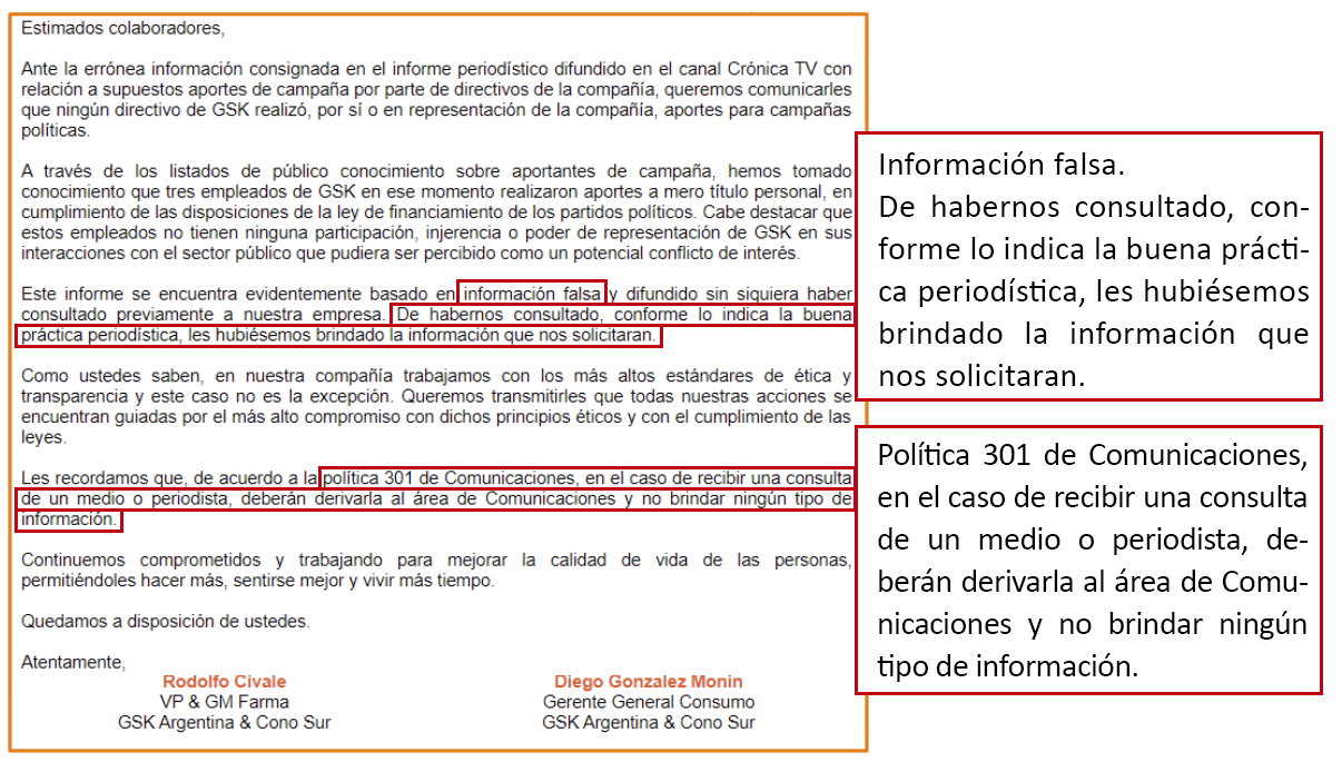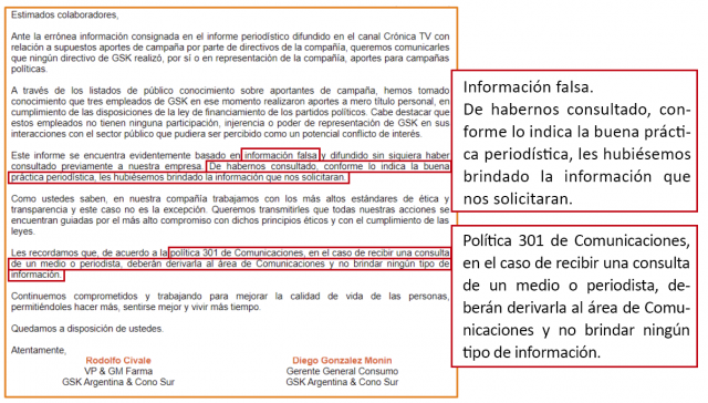 Incluso, esta semana Crónica TV consignó que dos directivos de GSK estarían involucrados entre los aportantes «grises». Sin embargo la multi se desligó a través de un comunicado interno en el que afirma que «de habernos consultado, conforme lo indica la buena práctica periodística, les hubiésemos brindado la información que nos solicitaran». Ver abajo.