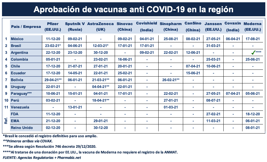 Con este respaldo, la COFEPRIS se suma así a otras agencias regulatorias de la región que ya aprobaron la vacuna de Sinopharm. En el listado figuran la DIGEMID, de Perú -que en enero se convirtió en el primer organismo en darle luz verde a este producto-; la ANMAT de Argentina; la AGEMED, de Bolivia; y la DNVS de Paraguay.