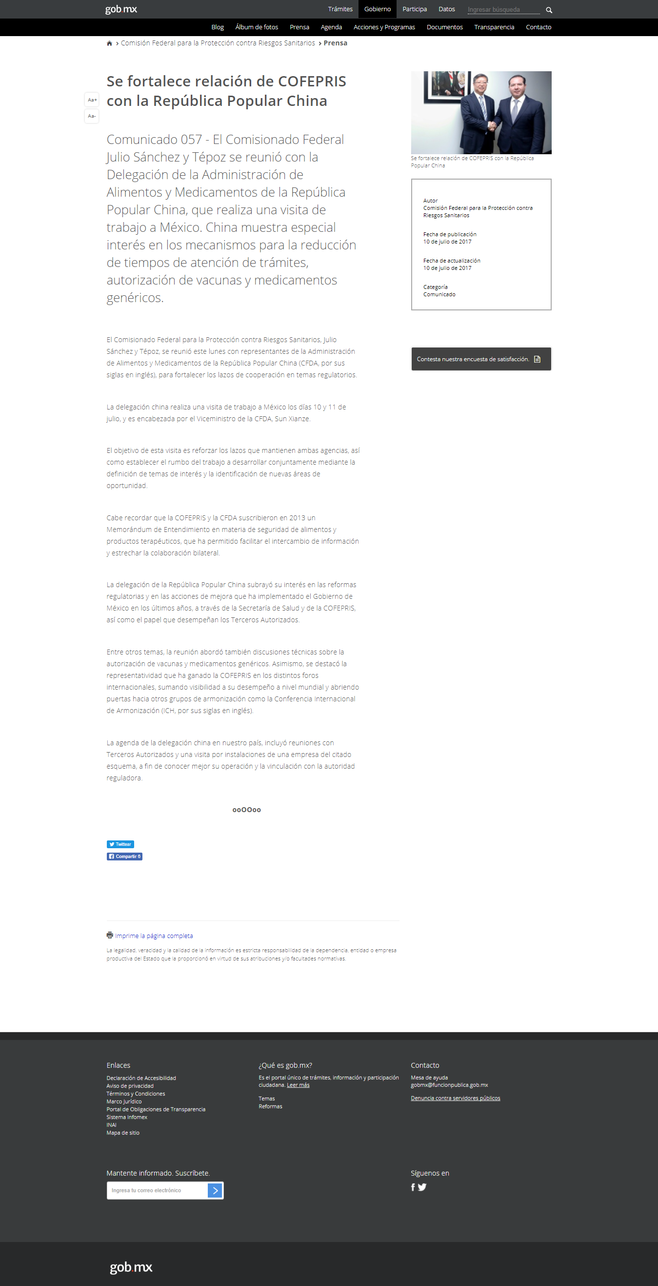 El titular de la COFEPRIS, Julio Sánchez y Tépoz, se reunió en México con representantes de la Administración de Alimentos y Medicamentos de la República Popular China, CFDA, en pos de fortalecer los lazos de cooperación bilateral.