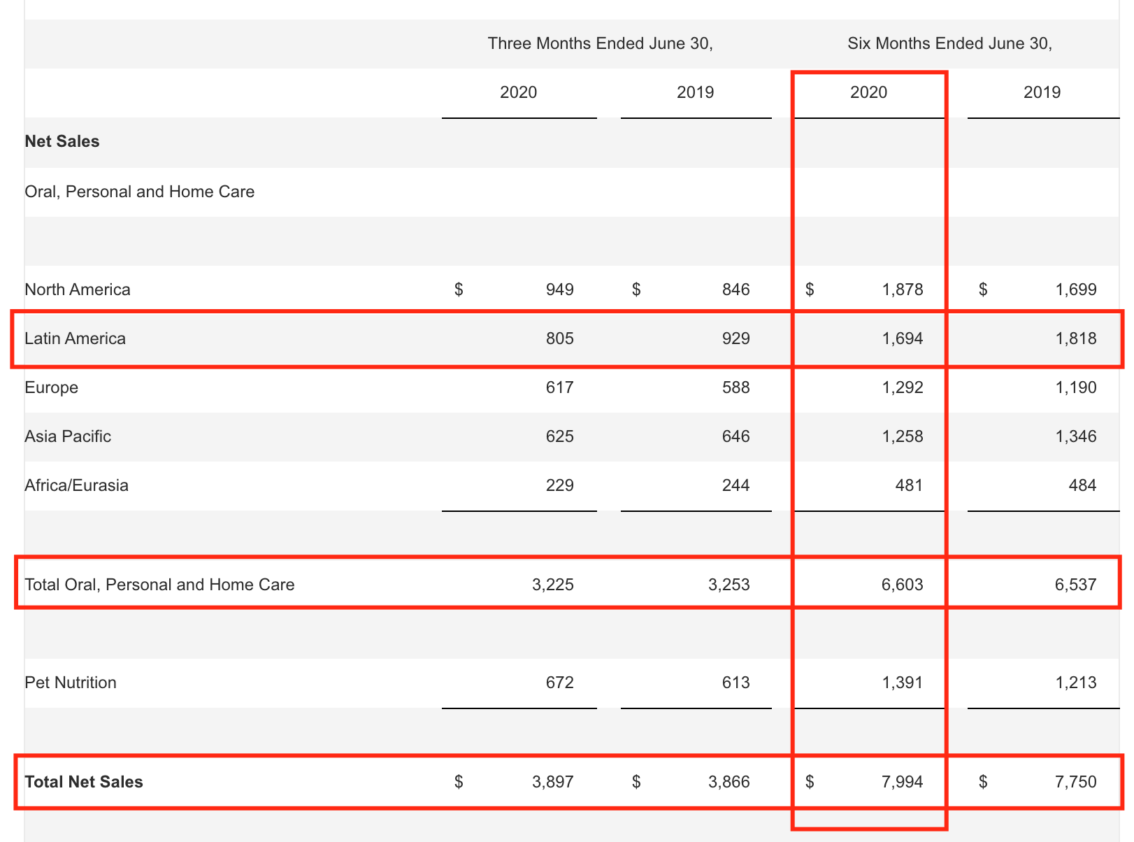 Dentro de su core-business, Estados Unidos desplazó a Latam como la fuente que genera los mayores ingresos para la compañía al presentar un crecimiento interanual del 10,5% a u$s 1.878 millones durante la primera mitad del año. En cambio, la facturación de Latinoamérica  cayó -6,8%  a u$s 1.694 millones. Igualmente el peso de región sigue siendo significativo para Colgate, ya que representa el 25,6%  de los ingresos de Oral, Personal and Home Care y el 21,2% de sus ventas totales.