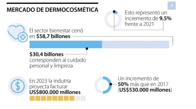 El 2022 fue un buen año para la industria del cuidado personal y bienestar en Colombia. Según un estudio de la Cámara de Cosmética y Aseo de la Asociación Nacional de Empresarios (Andi), el sector cerró con una facturación de 58,7 billones pesos colombianos (u$s 12.832,1 millones). De ellos, $30,4 billones (u$s 6.645,6 millones)correspondieron al cuidado personal y limpieza, cifra que representó un incremento de 9,5% respecto a 2021. Ver La República.