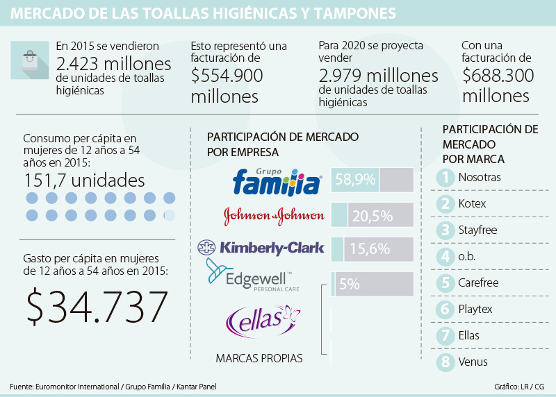 Quien está a la cabeza del negocio de higiene femenina colombiano es el Grupo Familia, que tiene un 58.9% de participación mercado. Le siguen Johnson & Johnson con el 20.5% y Kimberly-Clark con un 15.6%.