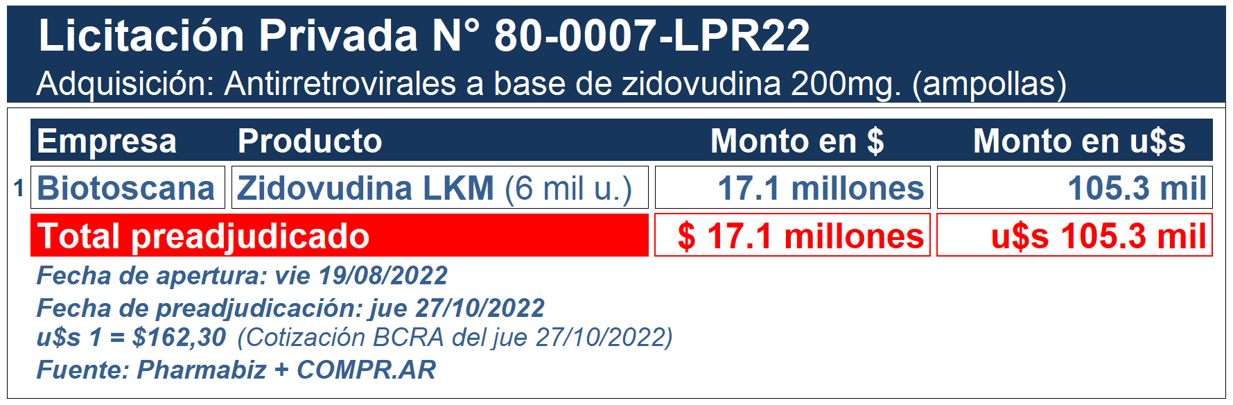 Biotoscana, del grupo canadiense Knight Therapeutics, continúa en carrera a fin de proveer al Estado de 6 mil unidades del inyectable Zidovudina LKM. De resultar finalmente adjudicataria, la licitación le podría implicar a la cartera sanitaria una erogación de $17.1 M (u$s 105.3 mil).