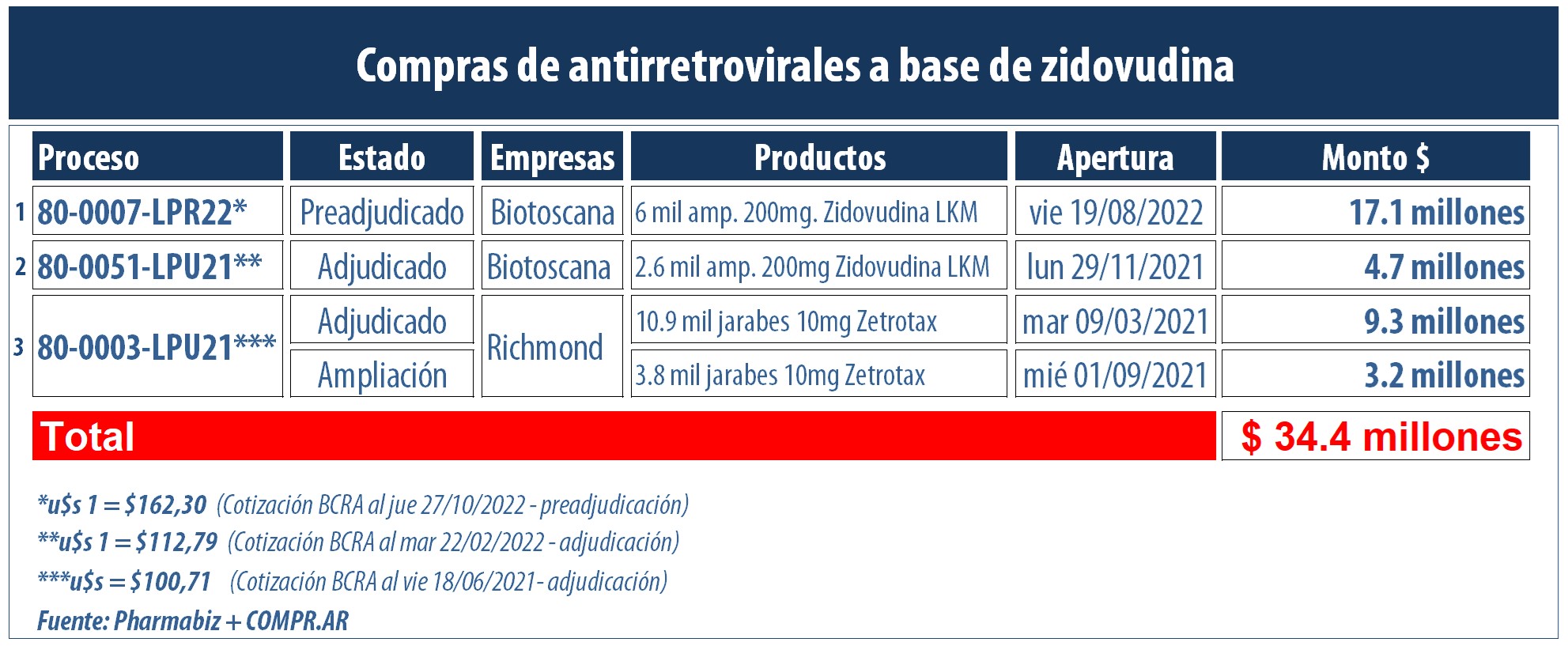 El Ministerio de Salud de la Nación preadjudicó una licitación privada a fin de adquirir partidas de antirretrovirales a base de zidovudina. La misma había abierto a mediados de agosto y muestra a una sola empresa como oferente. Ver Licitación