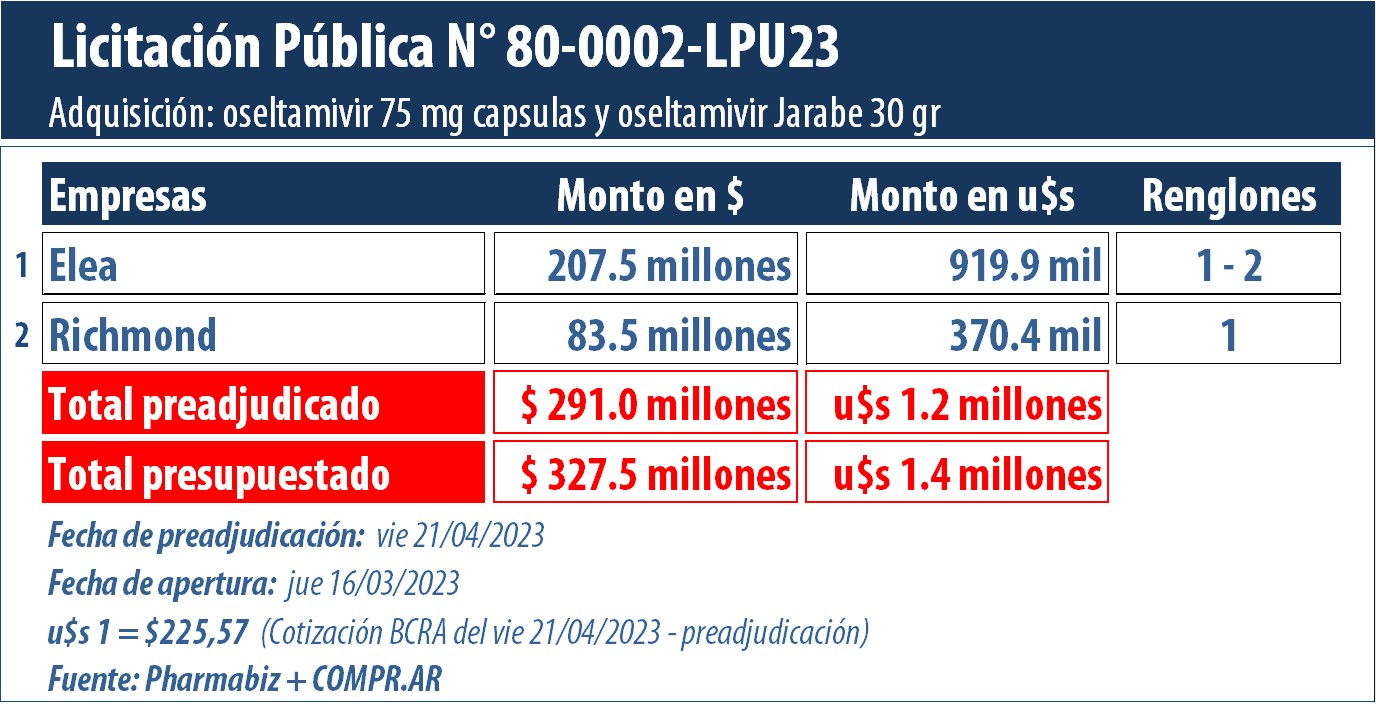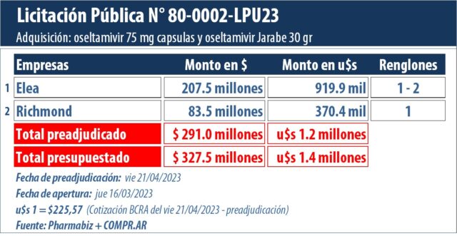 El Ministerio de Salud de la Nación preadjudicó una licitación pública, a fin de adquirir antivirales a base de oseltamivir, indicados para infecciones respiratorias agudas. Ver Licitación.