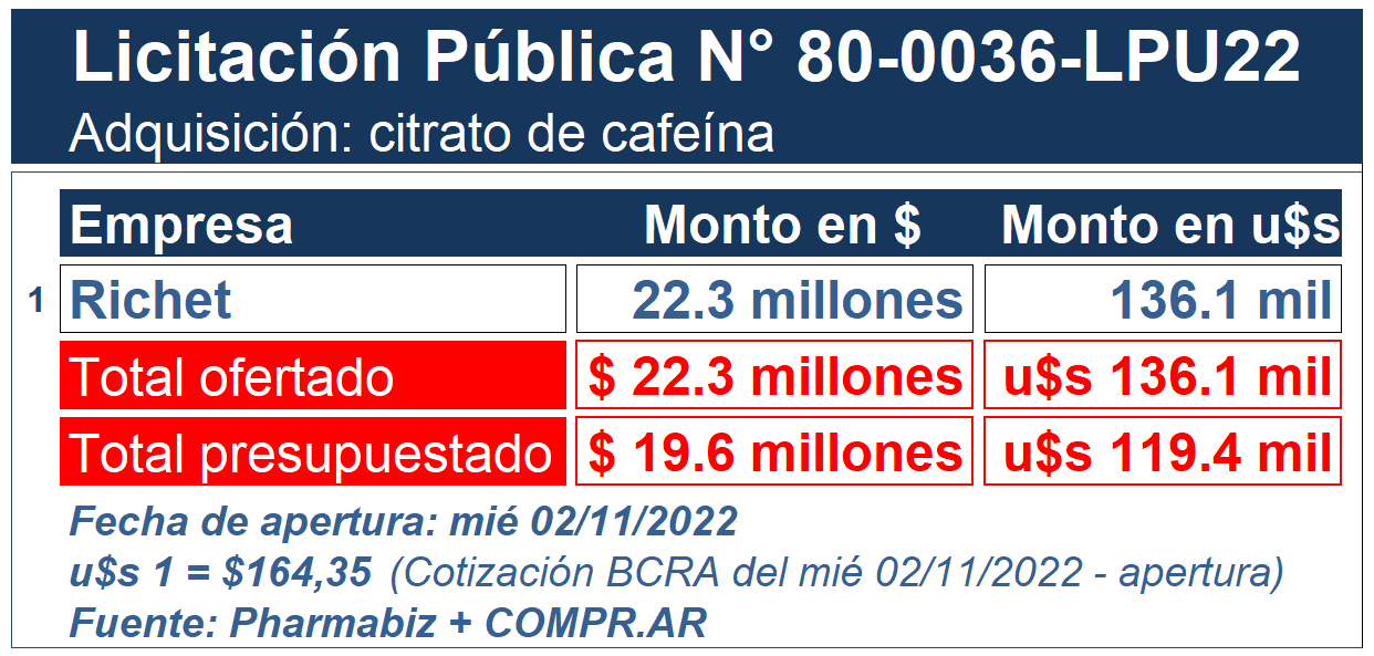 De acuerdo al análisis realizado por el equipo de Pharmabiz, a la licitación se inscribió un único oferente. Se trata del laboratorio nacional Richet, propiedad de la familia Tavosnanska, que se anotó a fin de cubrir el total solicitado por una suma de $22.3 millones (u$s 136.1 mil), lo cual representa un 14% más alto que el presupuesto inicial consignado por el Estado. Para ambos renglones, la firma listó su Cafeína Citrato Richet a un precio unitario de $1.119,11 (u$s 6,80), en la presentación de frascos ampolla de vidrio incoloro con tapón elastomérico y precinto de aluminio. Ver Cuadro Comparativo