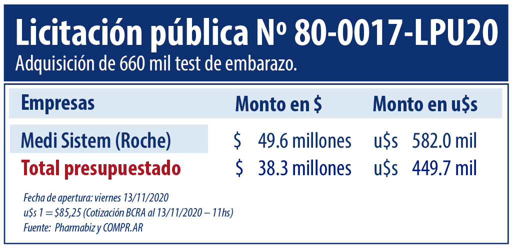 La única que se postuló a tales efectos fue la empresa Medi Sistem, que ofertó en representación de la suiza Roche. Aunque no especificó con qué marca participa, la firma cotizó un monto de $49.6 millones (u$s 582 mil). Dicha cifra representa casi un 30% más que el presupuesto que había estimado la cartera de Salud, que alcanza los $38.3 millones (u$s 449.7 mil).
