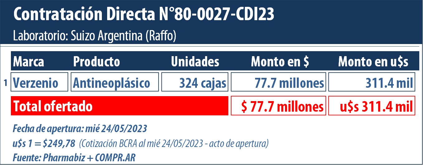 Se trata de una contratación directa por exclusividad, la que tiene como contraparte a Suizo Argentina. La misma incluye 108 cajas de 14 comprimidos cada una, de tres presentaciones diferentes: 50 mg.; 100 mg.; y 150 mg. de abemaciclib.