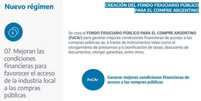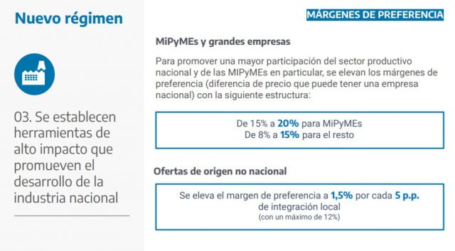 Además, no es menor destacar que en la actualidad ya existe una Ley de Compre Argentino que otorga márgenes de preferencia para oferentes de bienes de origen nacional. El rango de este beneficio se ubica hoy entre el 7% y el 15%. Mediante esta iniciativa se apunta a que el gap sea del 20% en el caso de ofertas realizadas por Micro, Pequeñas y Medianas Empresas (MiPyMEs).