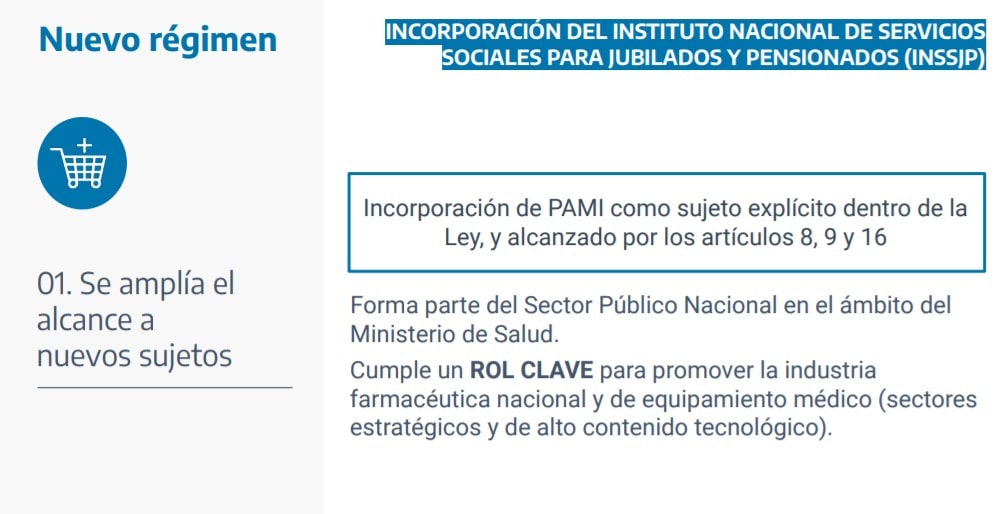 Además de ello, Kulfas explicó que uno de los objetivos es ampliar la cantidad de sujetos públicos que están incorporados, y entre ellos nombró al PAMI. La idea, dijo, es que se pueda contar con mayor producción nacional, ahorrando costos, generando desarrollo productivo y también generando divisas. El funcionario de industria señaló además otro de los ejes del proyecto que es el desarrollo de un programa nacional de compras públicas para innovación, el que se trabajó en relación con el equipo de Fernando Peirano, titular de la Agencia Nacional de Promoción de la Investigación, el Desarrollo Tecnológico y la Innovación, organismo que cuelga del Ministerio de Ciencia, Tecnología e Innovación. La intención es que el Estado pueda financiar investigaciones para generar soluciones a problemas públicos, dijo. Y allí se refirió específicamente a los productos medicinales y biotecnológicos. Ver Proyecto