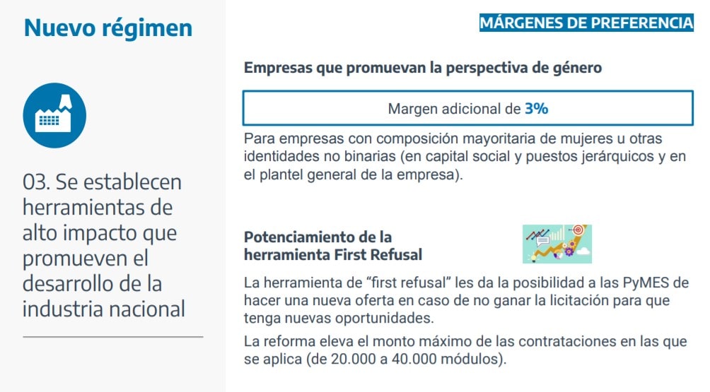 Para las grandes firmas, los márgenes son en la actualidad del 5 al 8% y se espera llevarlos al 15%. En ambos casos, a esto se suma una preferencia adicional del 3% para compañías integradas en un 50% a nivel accionario, gerencial o de recursos humanos por mujeres o identidades no binarias.
