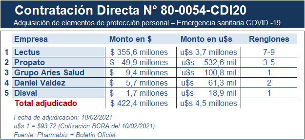 Propato Hnos. fue la segunda gran ganadora de esta compulsa pública. La empresa local le entregará al Estado 50 mil máscaras de protección de policarbonato y 1,8 millones de guantes de uso medicinal de tamaño chico, mediano y grande por $49,9 millones (u$s 532,6 mil).