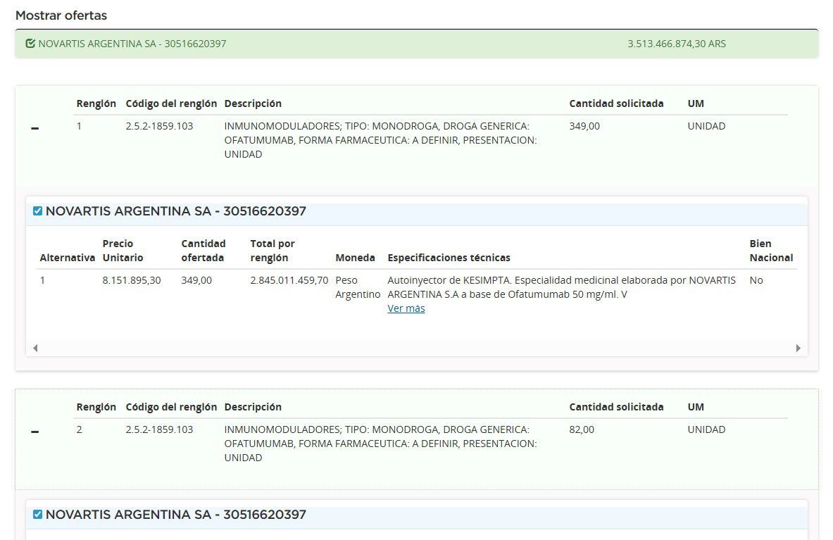 El proceso, dirigido a la Secretaría Nacional de Discapacidad que comanda actualmente Alejandro Vilches, consta de dos renglones por diferentes cantidades del mismo producto. El primero detalla un pedido de 349 autoinyectores de ofatumumab 20mg, y el segundo especifica otros 82. Durante la apertura, la multi se presentó con una oferta total de $3.513 M (u$s 2.47 M). Ver Cuadro Comparativo