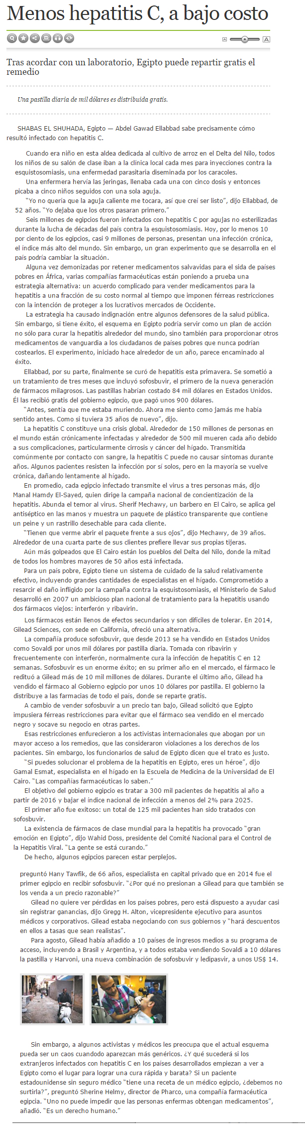 Su artículo, titulado “Curing Hepatitis C, in an Experiment the size of the Egypt” y replicado por el diario Clarín en su edición del sábado 2 de enero, repasó la estrategia llevada a cabo por la biotecnológica para frenar la hepatitis C en Egipto, un país donde esta enfermedad está más que extendida.