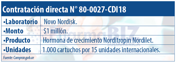La multi recibirá por parte del Estado más de $1 millón (u$s 44 mil) en concepto de la venta de 1.000 cartuchos ampolla por 15 unidades internacionales (UI) de su hormona de crecimiento recombinante Norditropin Nordilet, a base de somatotrofina.