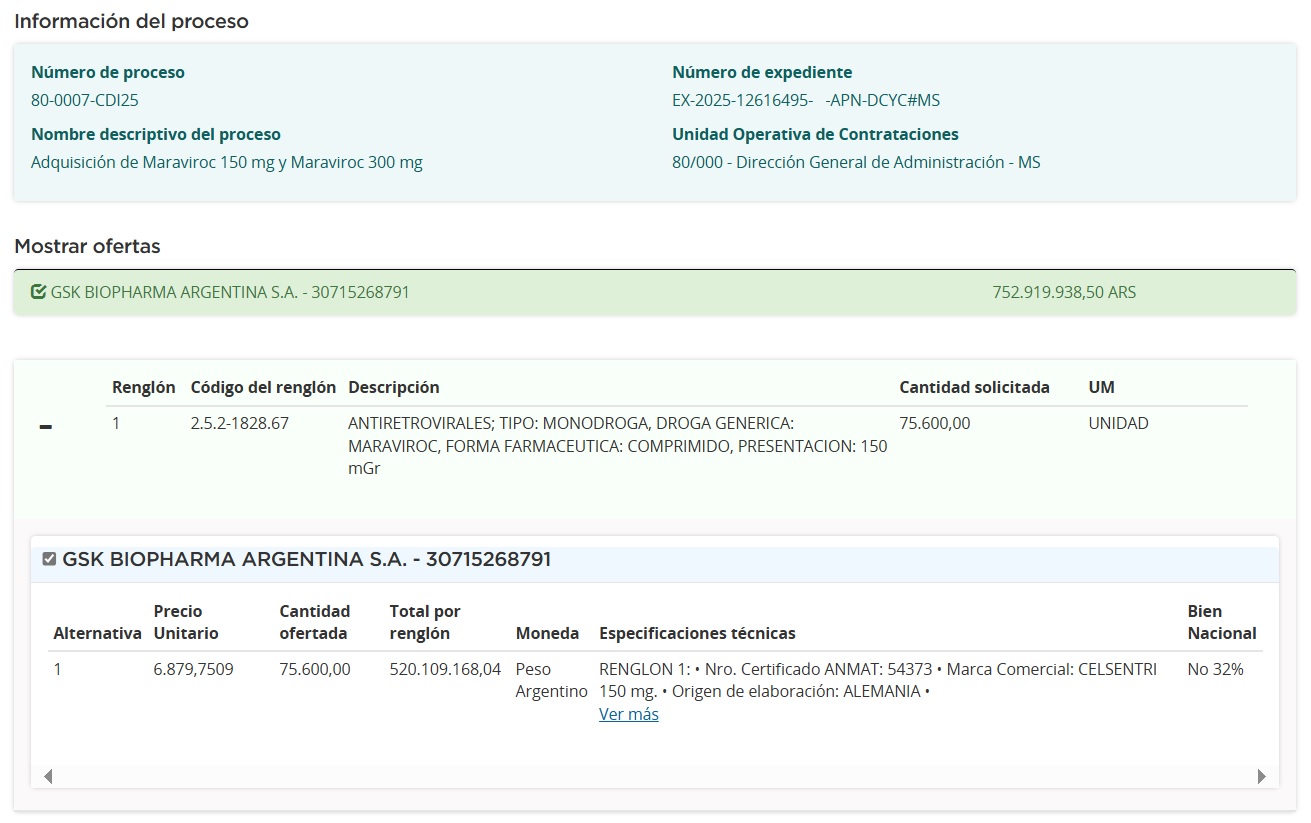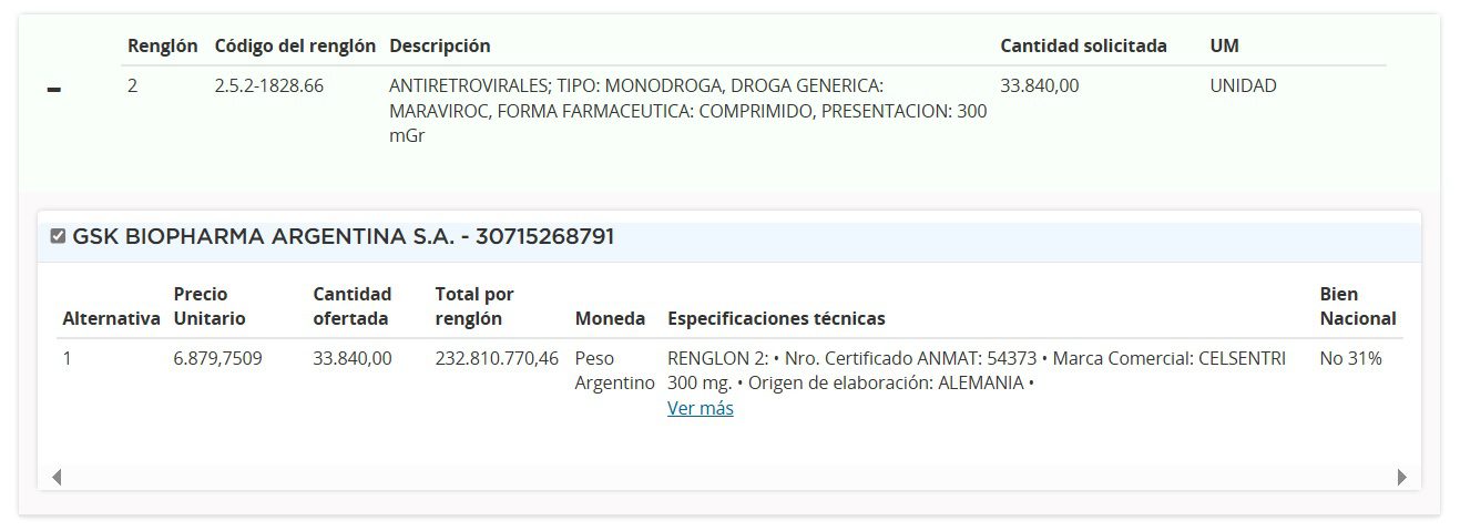 El proceso apunta a la adquisición de 1.260 cajas de 60 comprimidos de Celsentri, a base de maraviroc 150mg para el primer renglón, y 564 cajas de 300mgs para el segundo. Según pudo identificar el equipo de analistas de Pharmabiz, GSK podría facturar hasta $753 M (u$s 687.805) de concretarse la compra. Ver Pliego