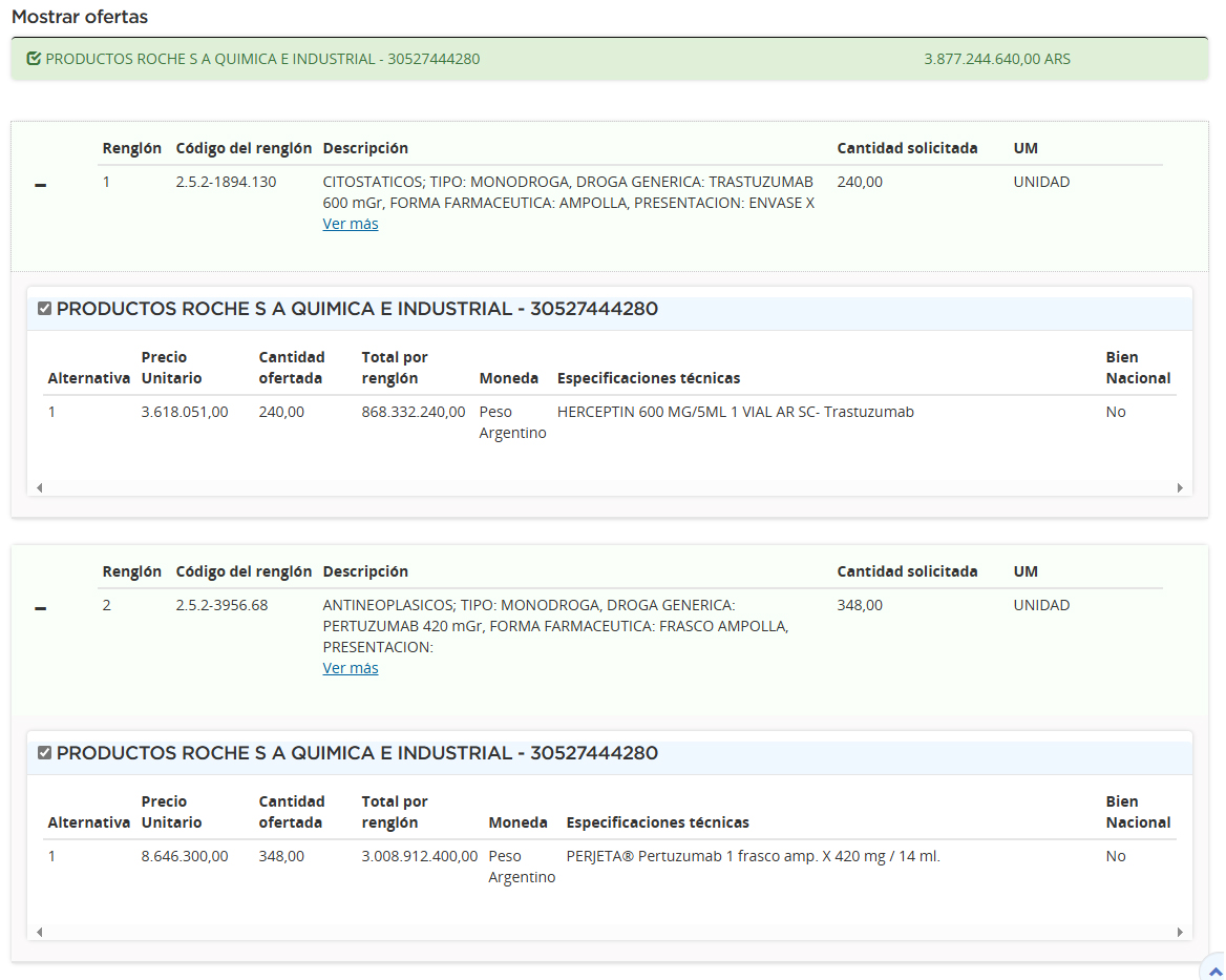 El proceso detalla dos renglones, los que incluyen 240 frascos ampolla del antineoplásico Herceptin, a base de trastuzumab 600 mg; y 348 frascos para perfusión del citostático Perjeta, desarrollado a base de pertuzumab 420 mg/147 ml. Se trata de dos anticuerpos monoclonales indicados para el cáncer de mama metastásico HER2 positivo. Por estos tratamientos, la multi realizó una oferta que alcanza los $3.877 M (u$s 3.28 M). Ver Cuadro Comparativo