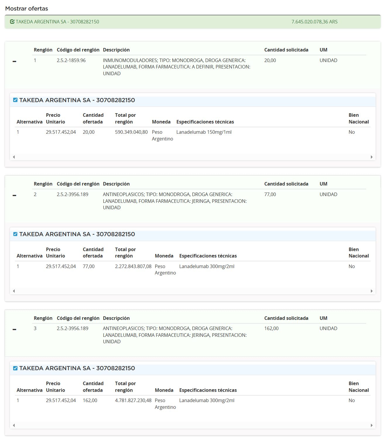 Es así que este proceso, cuyo contrato de provisión tendrá una extensión de un semestre, está conformado por tres renglones. El primero detalla una provisión de 20 unidades del producto a base de lanadelumab 150mg, mientras que el segundo implica 77 unidades de 300mg, y ambos están dirigidos a la Dirección Nacional de Asistencia Directa Compensatoria. El último renglón también solicita jeringas prellenadas en su presentación por 300mg, específicamente 162 y para la Dirección Nacional de Acceso a los Servicios de Salud. Ver Pliego