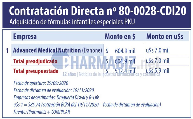 A mediados de octubre del 2019, la -por entonces- Secretaría de Salud de la Nación preadjudicó una licitación de fórmulas PKU por $517.8 mil (u$s 8.7 mil*), en la cual también el grupo Danone fue el elegido. La multi se había anotado en esa oportunidad a través de la distribuidora local Nutri Service. Ver artículo.